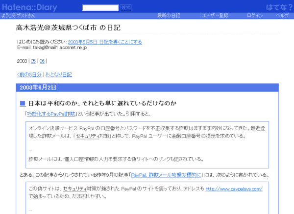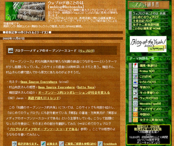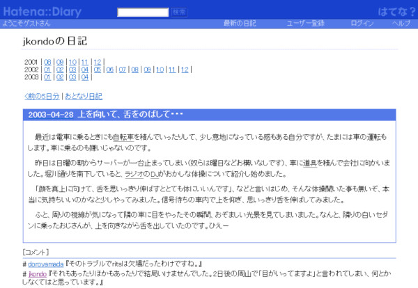 2003年に開設した代表的なブログとして、はてなの代表である近藤淳也の『jkondoの日記』、